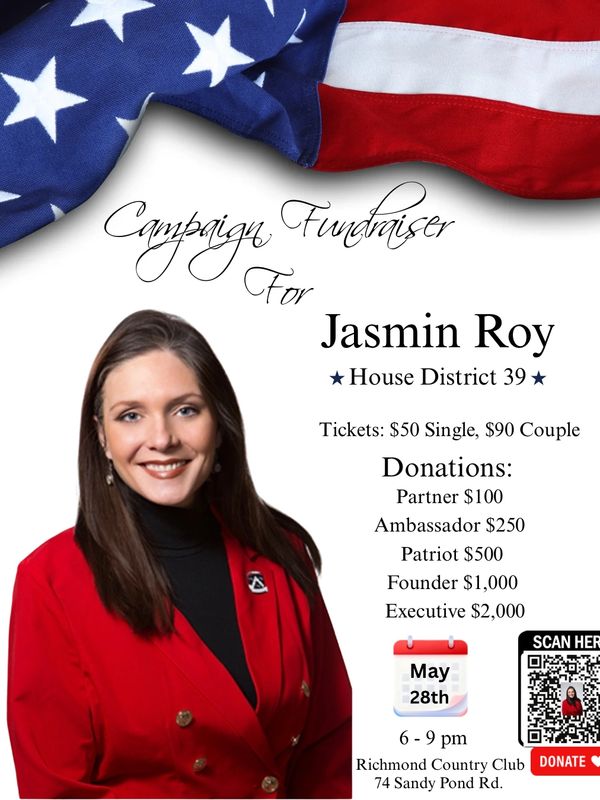 I am pleased to invite you to a fundraiser for RI House District 39 candidate Jasmin Roy. Please purchase your tickets through the WinRed link provided. May 28,2026, join me at The Richmond Country Club for great food, silent auctions, important conversations and a cash bar. I look forward to seeing everyone who's sharing this journey to victory!!